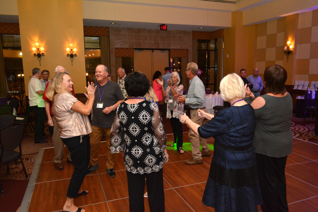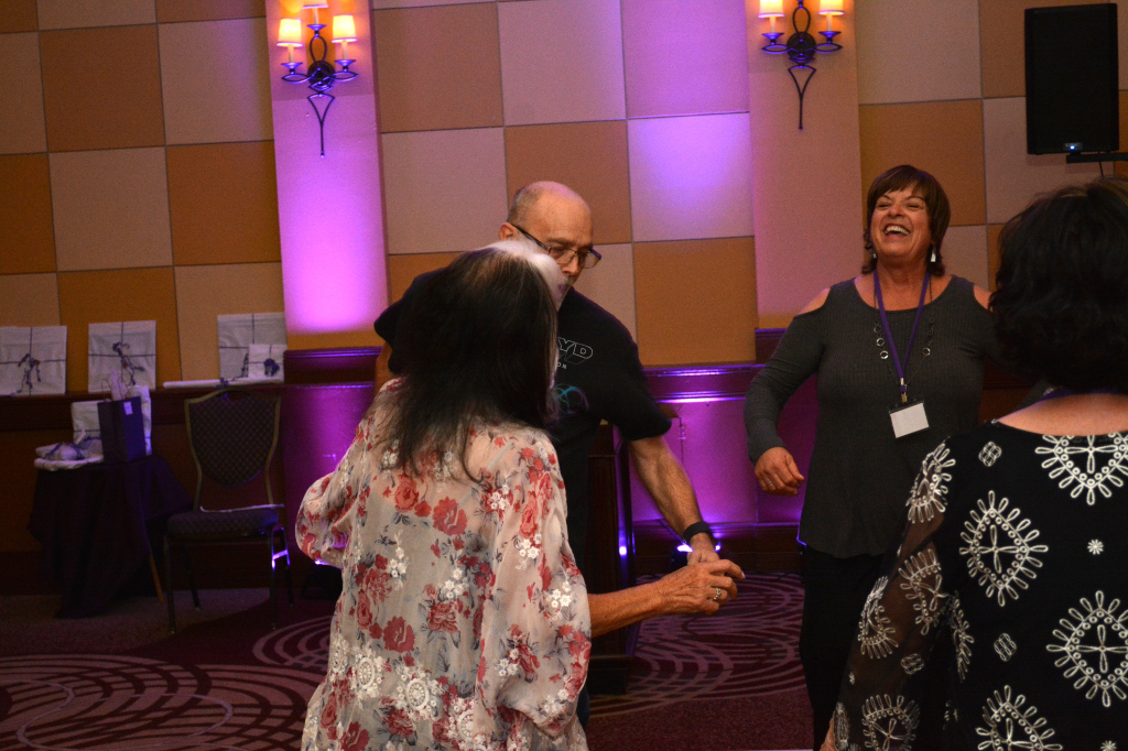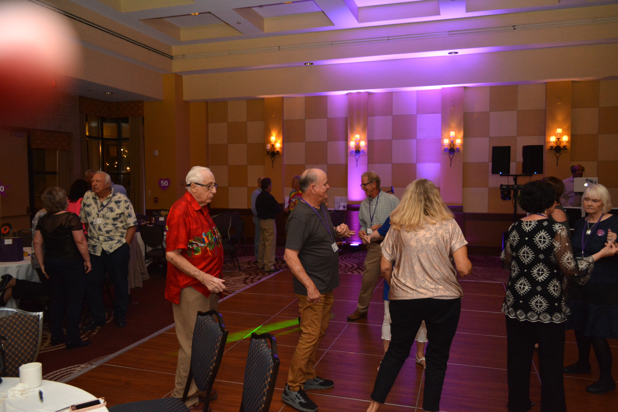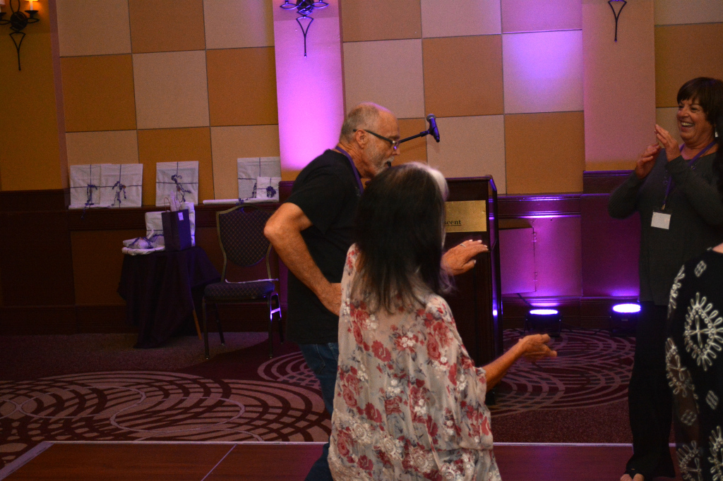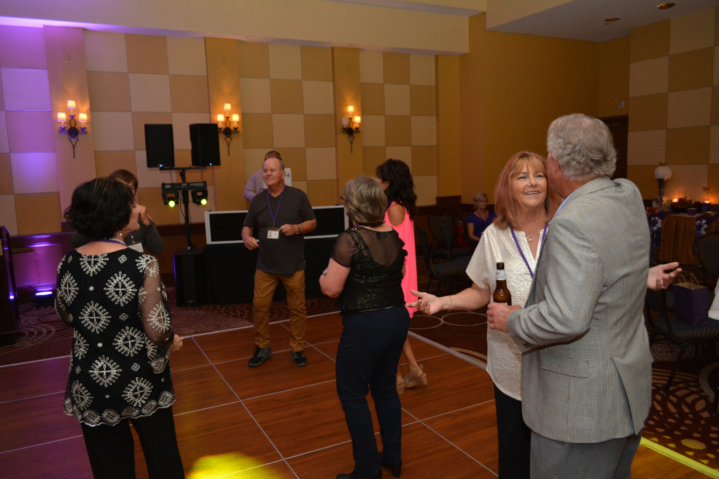 dress. Debbie Dorius and Bob Ross are using the dance floor as a