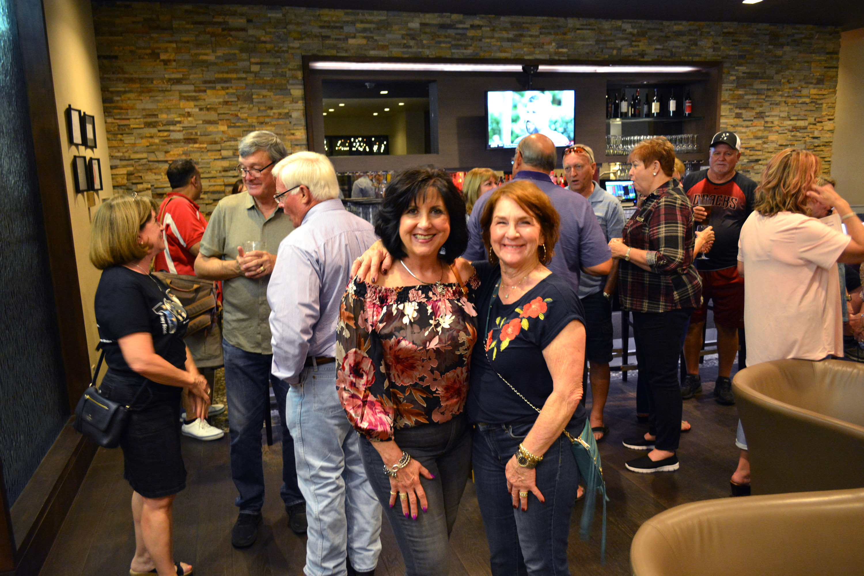 It appears the Friday's gathering has a lot of classmates present. Patty Sweeney and Kathy Norris are ready for their pictures to be taken. You will see that they act like a magnet pulling in others to have their picture taken.