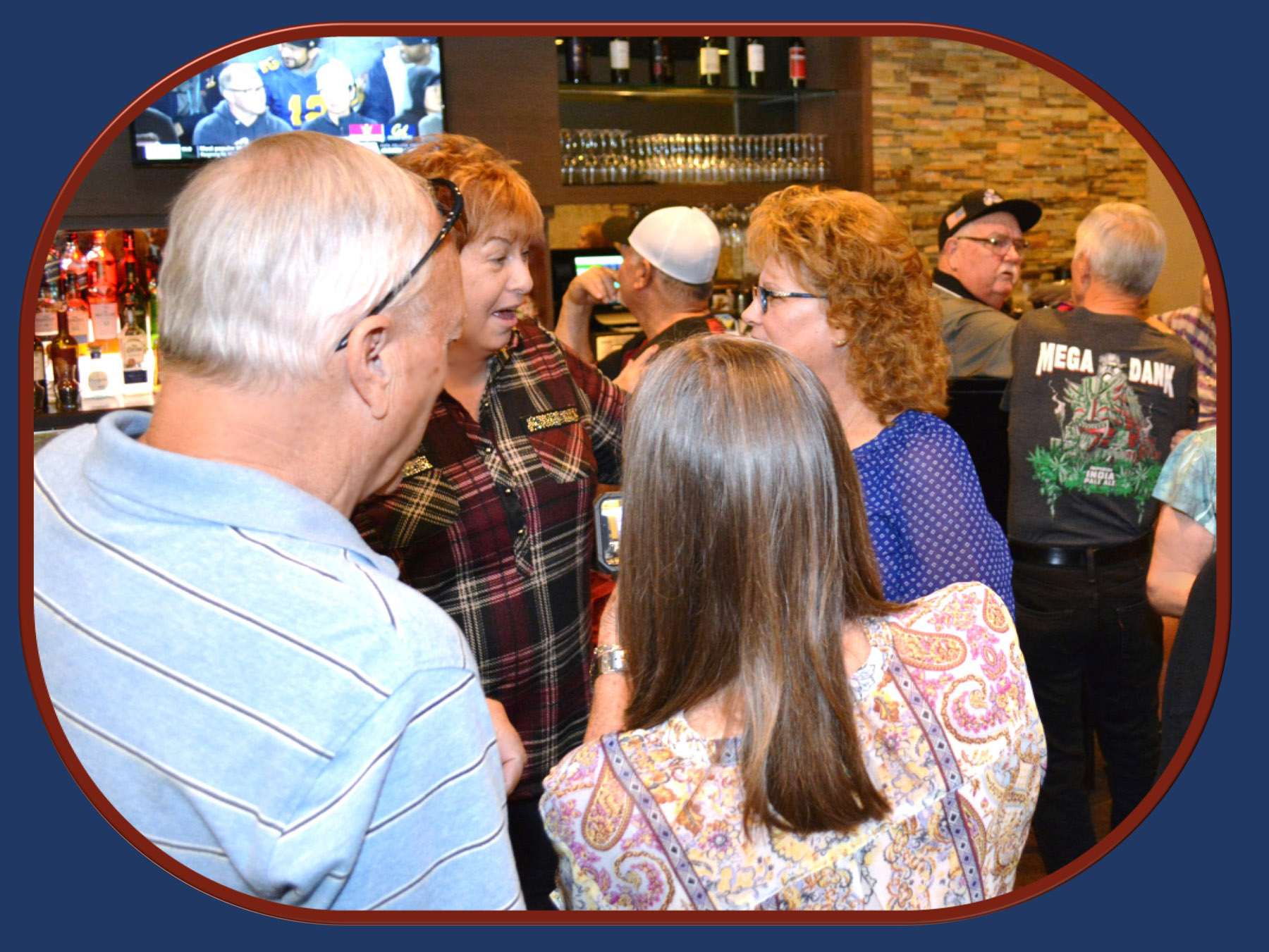 Now Kathy Norris is getting some competition with another Kathy, Kathy (Winter) Whittaker who is front and center of this nice photo. It appears that Kathy was showing Ron and the lady in the blue dress a photo of a Time Tunnel wall. When I zoomed in on her phone, I could see it was showing photos from the 25 and 30 year reunions next to a poster showcasing Mark Holmesley's fiddle making skills.