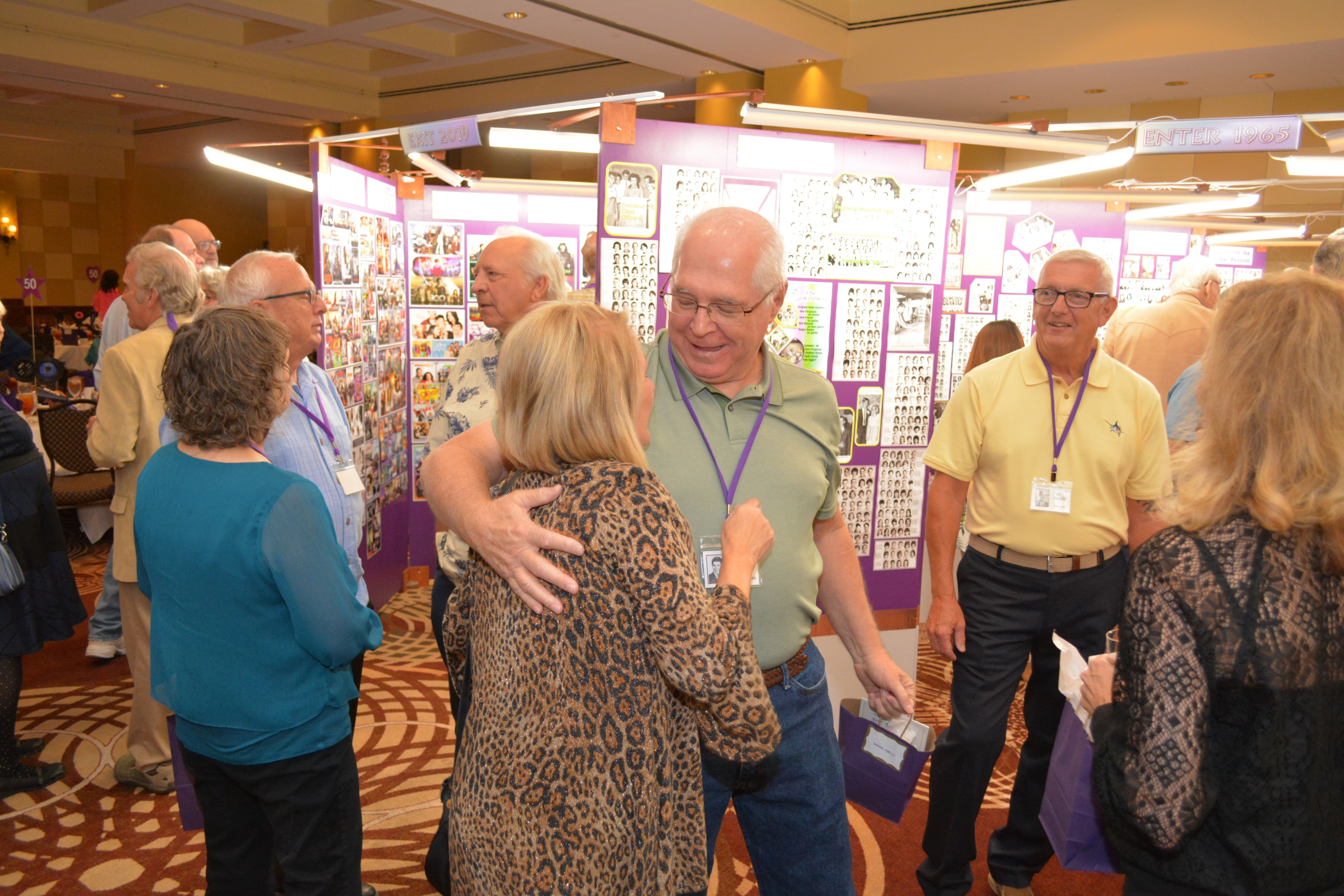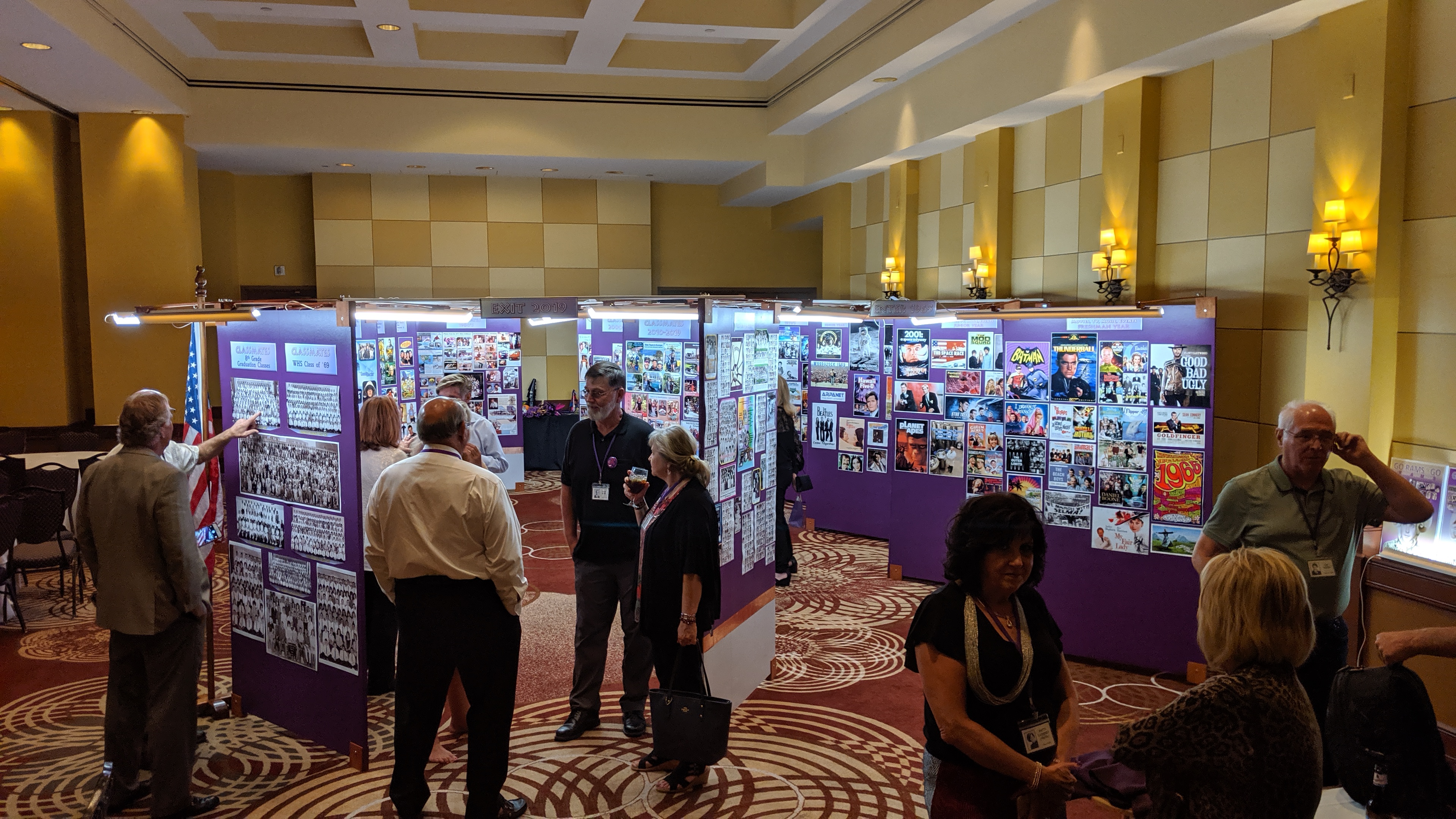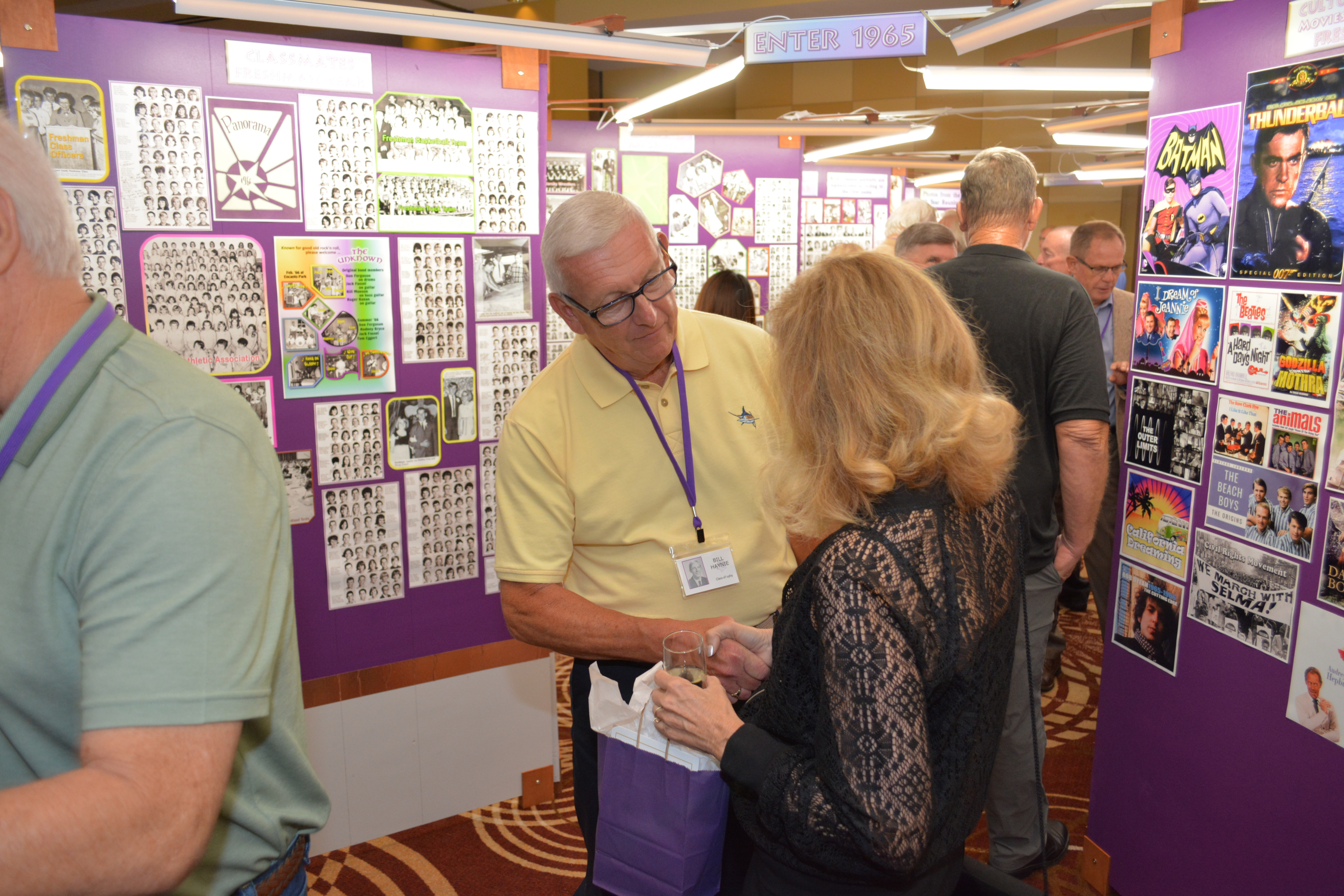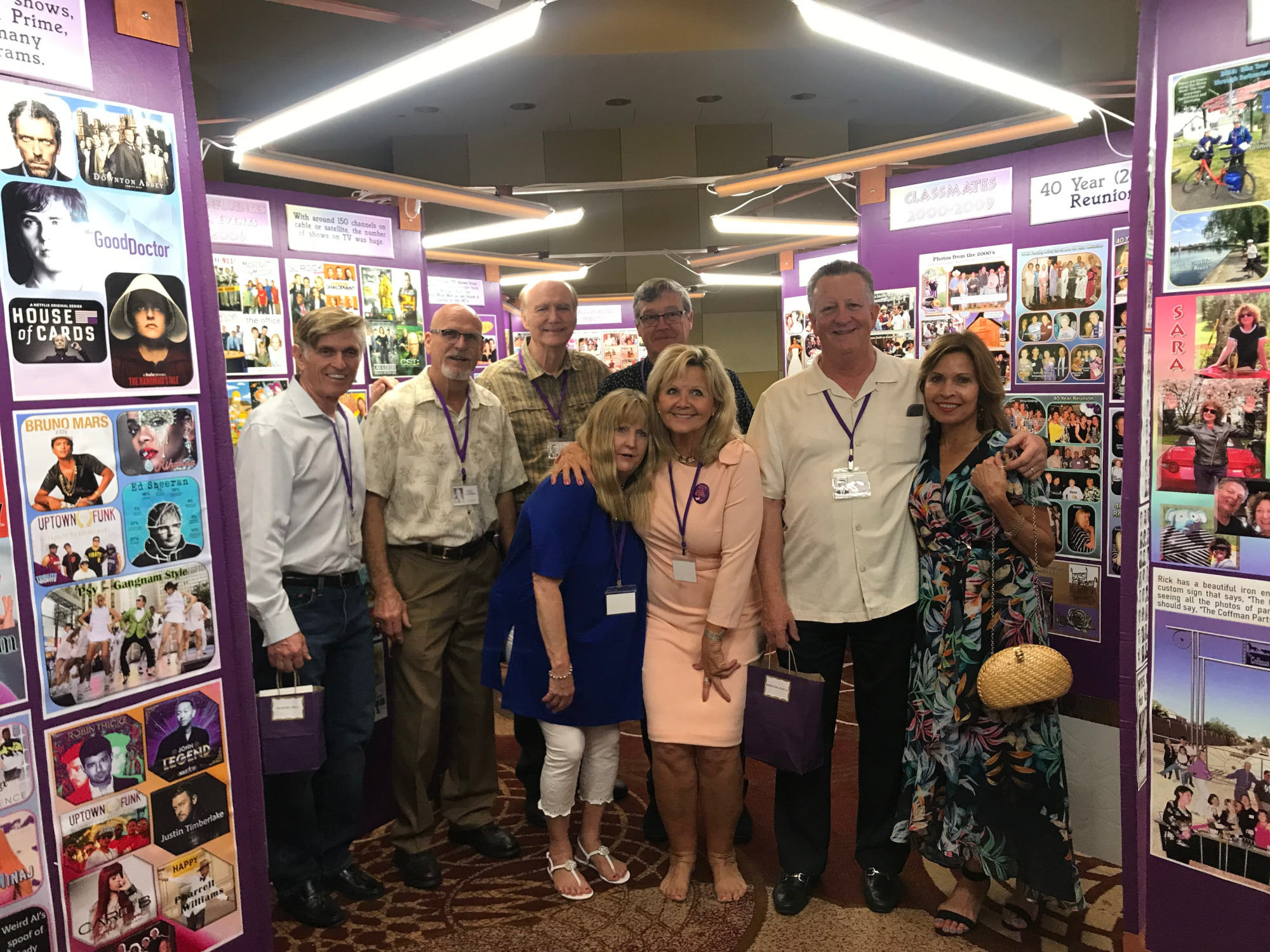 reunion. Over my left shoulder is a wall showing classmate photos from