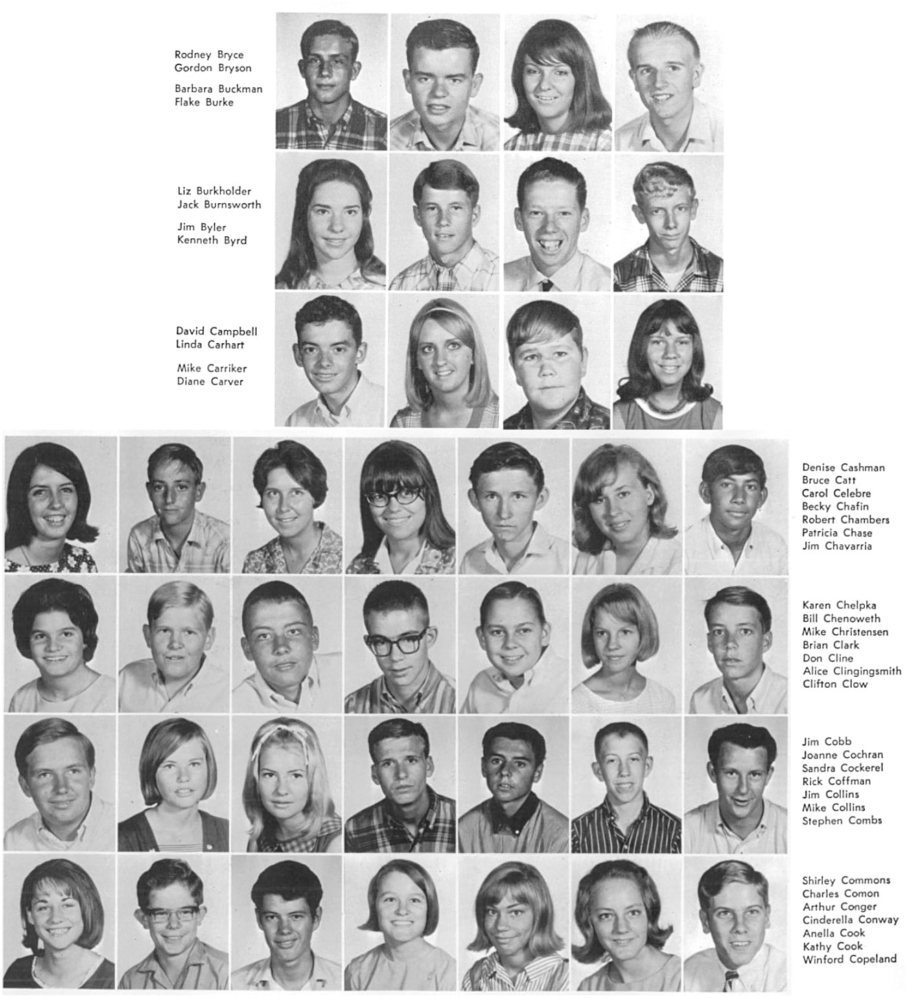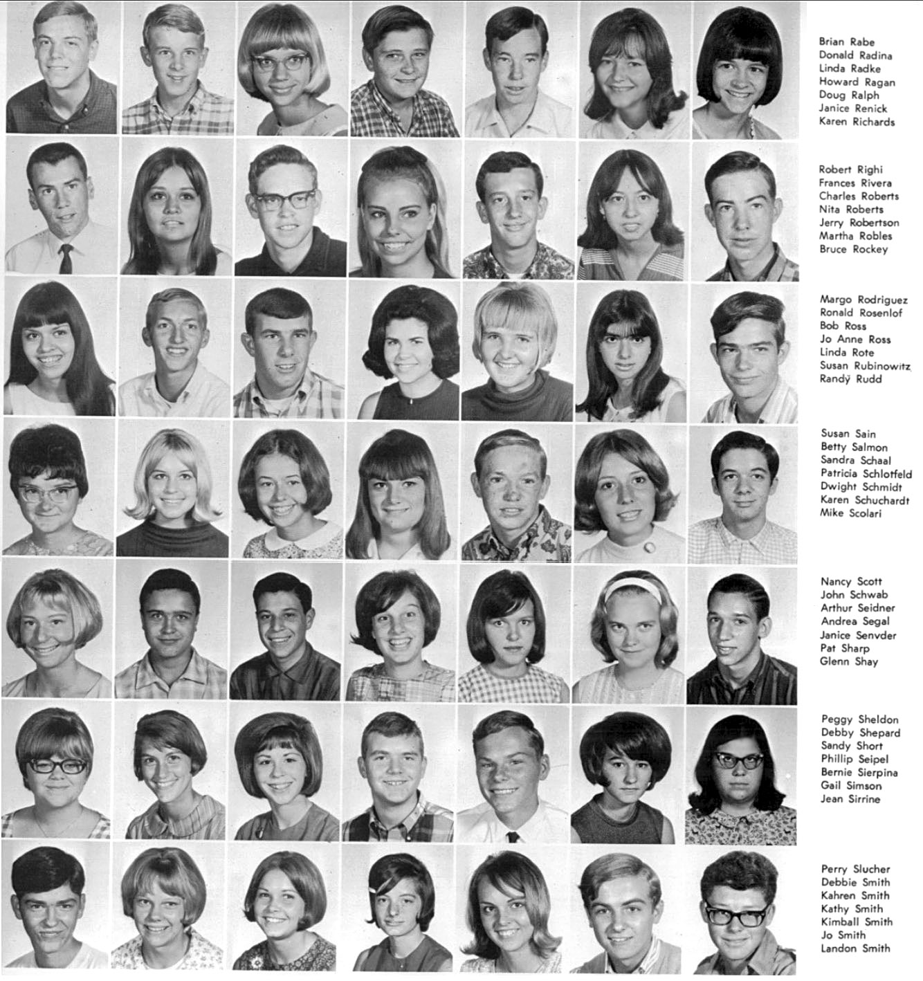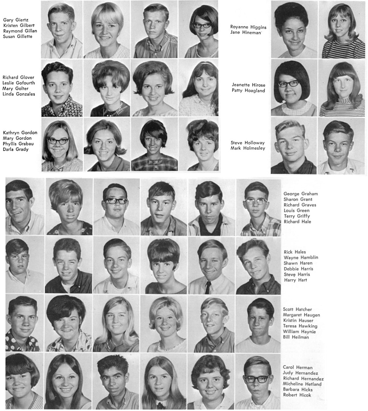 | The below layout of images approximates what was on the original sophomore photo wall. Click on the below photos to see the high resolution version of the photo. You may see a magnifying glass "+" icon meaning when you click on the photo, it will zoom to an enlarged version. Clicking again, returns it to the smaller size. When viewing the larger size, you can roll the mouse wheel to scroll up and down. On touch-sensitive screens, you can use the two finger pinch to enlarge and reduce the image. Download the photo by clicking with the right mouse button to see a pop-up menu, then choosing "Save Picture as..." or "Save Image as..." or something similar to that. On a Mac without a right mouse button, press and hold down the control (CTRL) key while clicking mouse to see the pop-up menu. To return to this page, click the go back arrow ← at the top (left) of the browser window. Also pressing the CTRL key with + or - keys will enlarge or reduce the overall screen size. | ||||