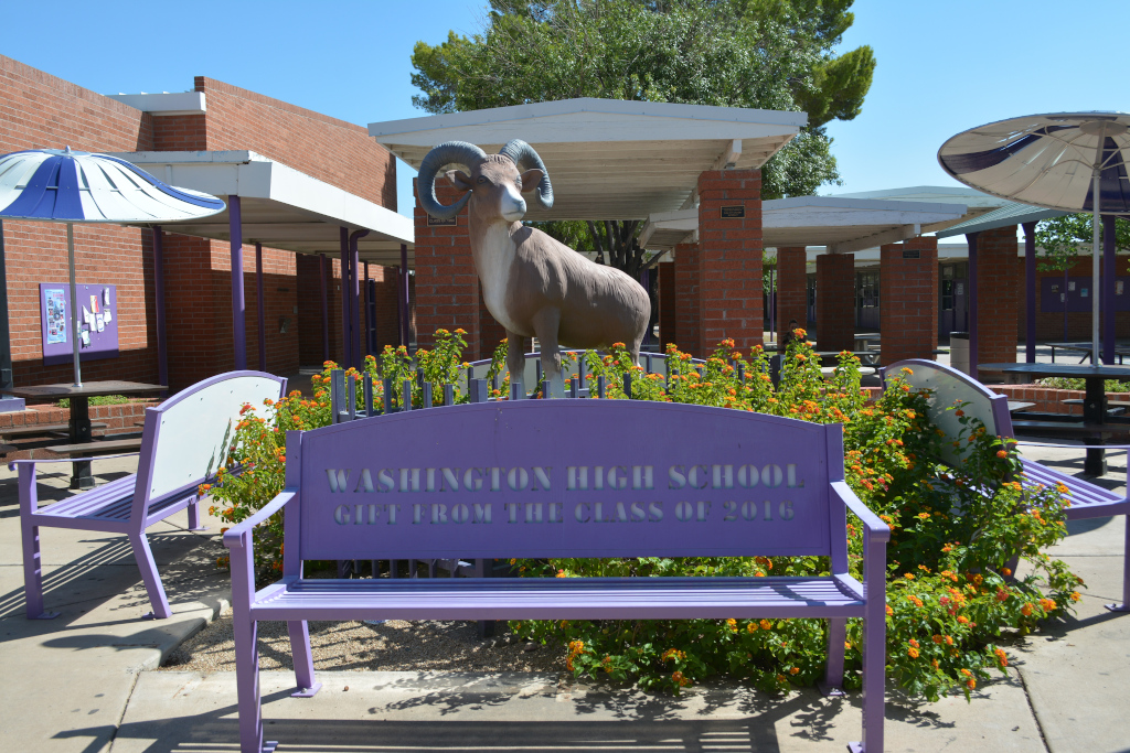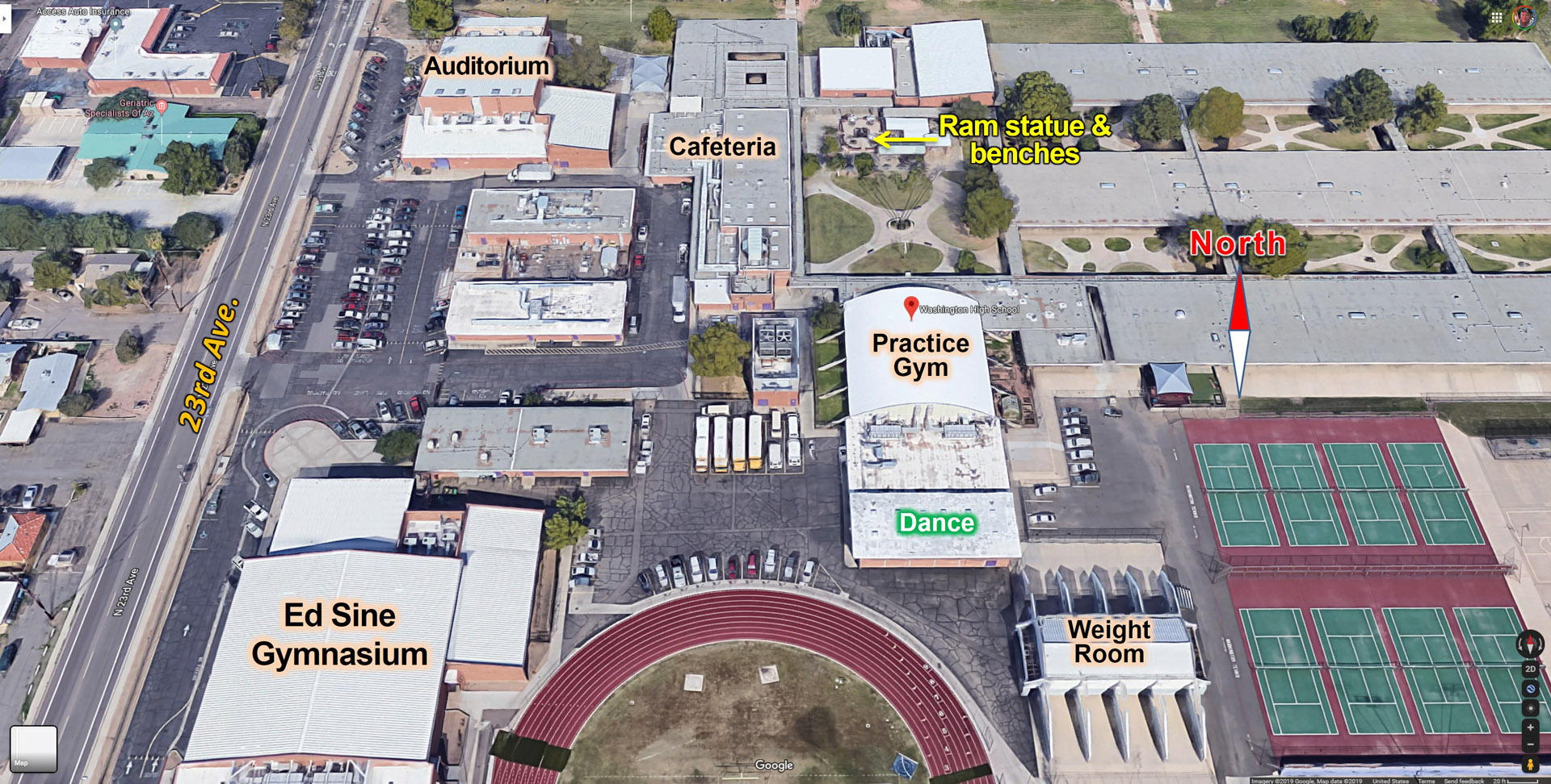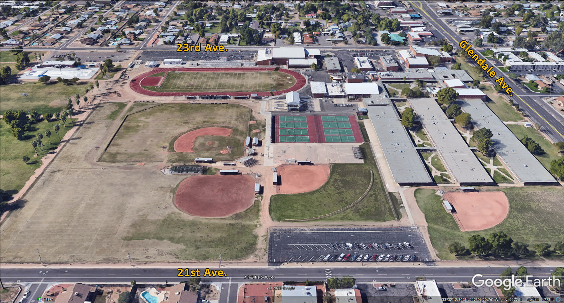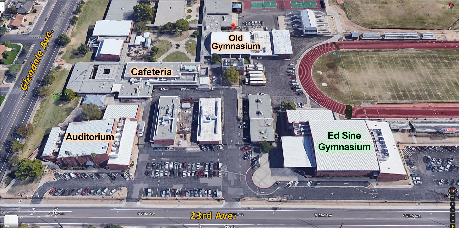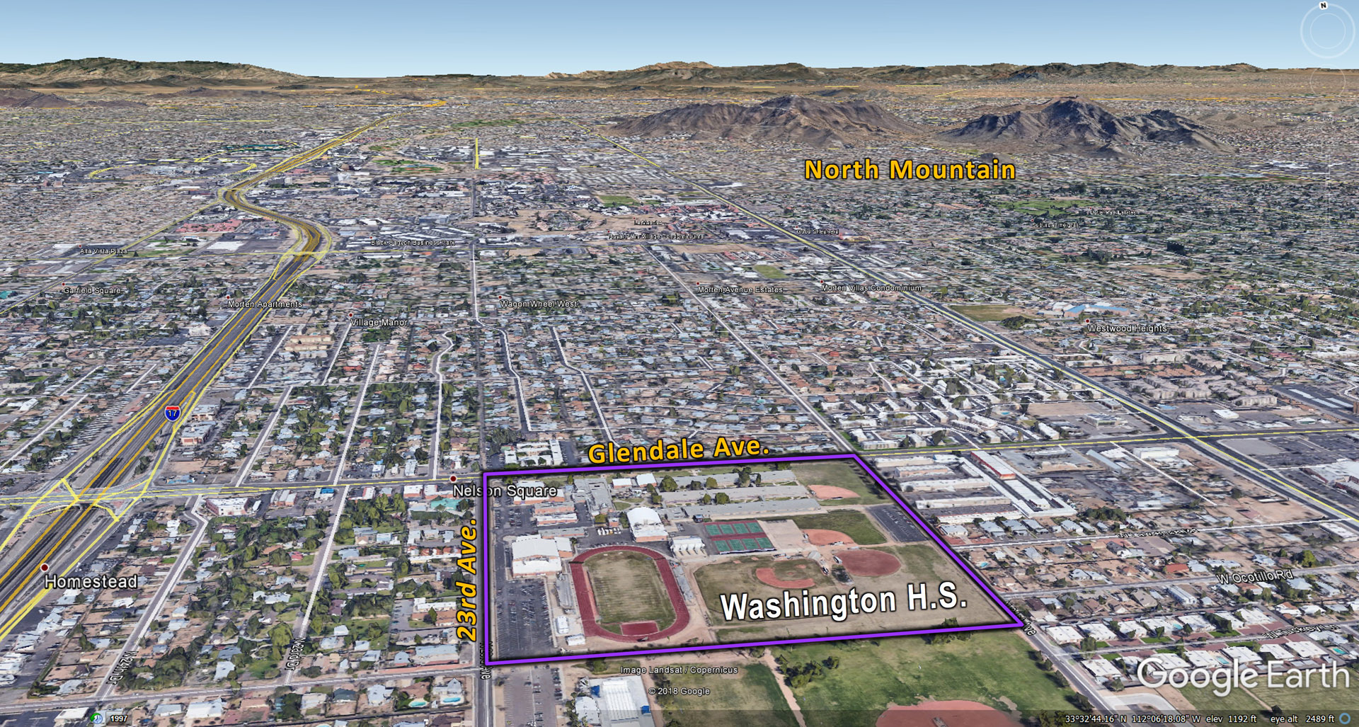 Here is an aerial view of the Washington High School campus shown with a purple line around it. Just south of the football field is a public swimming pool, which is used for some classes and sports at Washington High School. I-17 freeway is on the left and North Mountain can be seen at the top of the image.