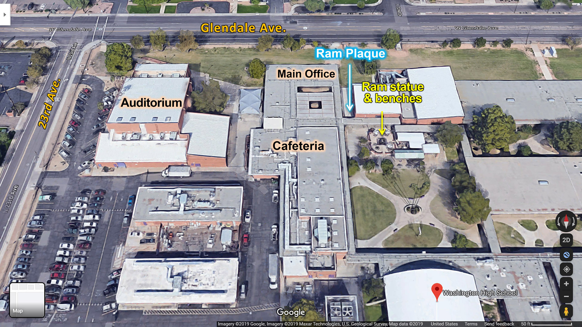 This is a closeup of the northwest corner of the campus. North is at the top where we see Glendale avenue. The meeting place was at the ram plaque next to the Main Office.
