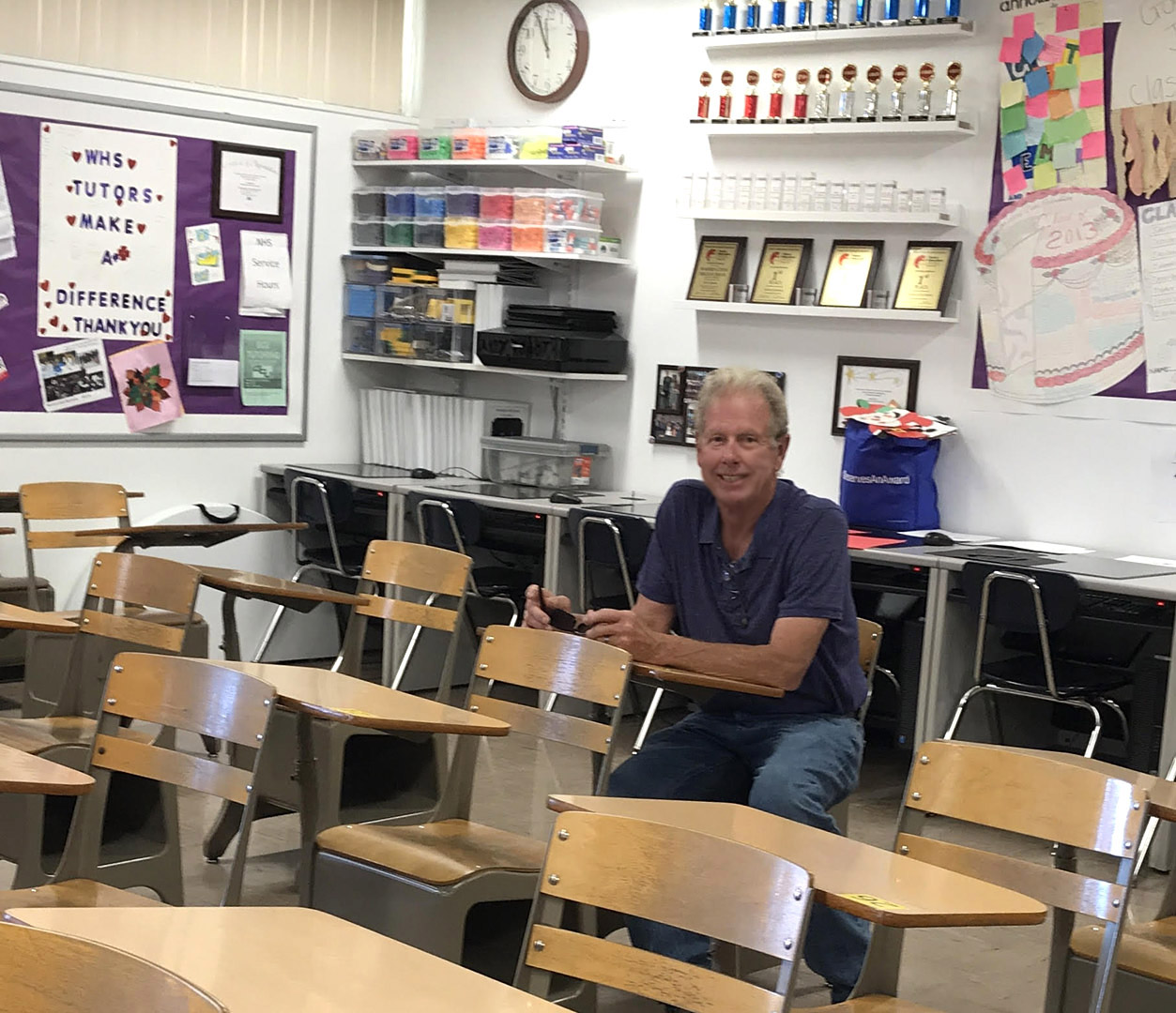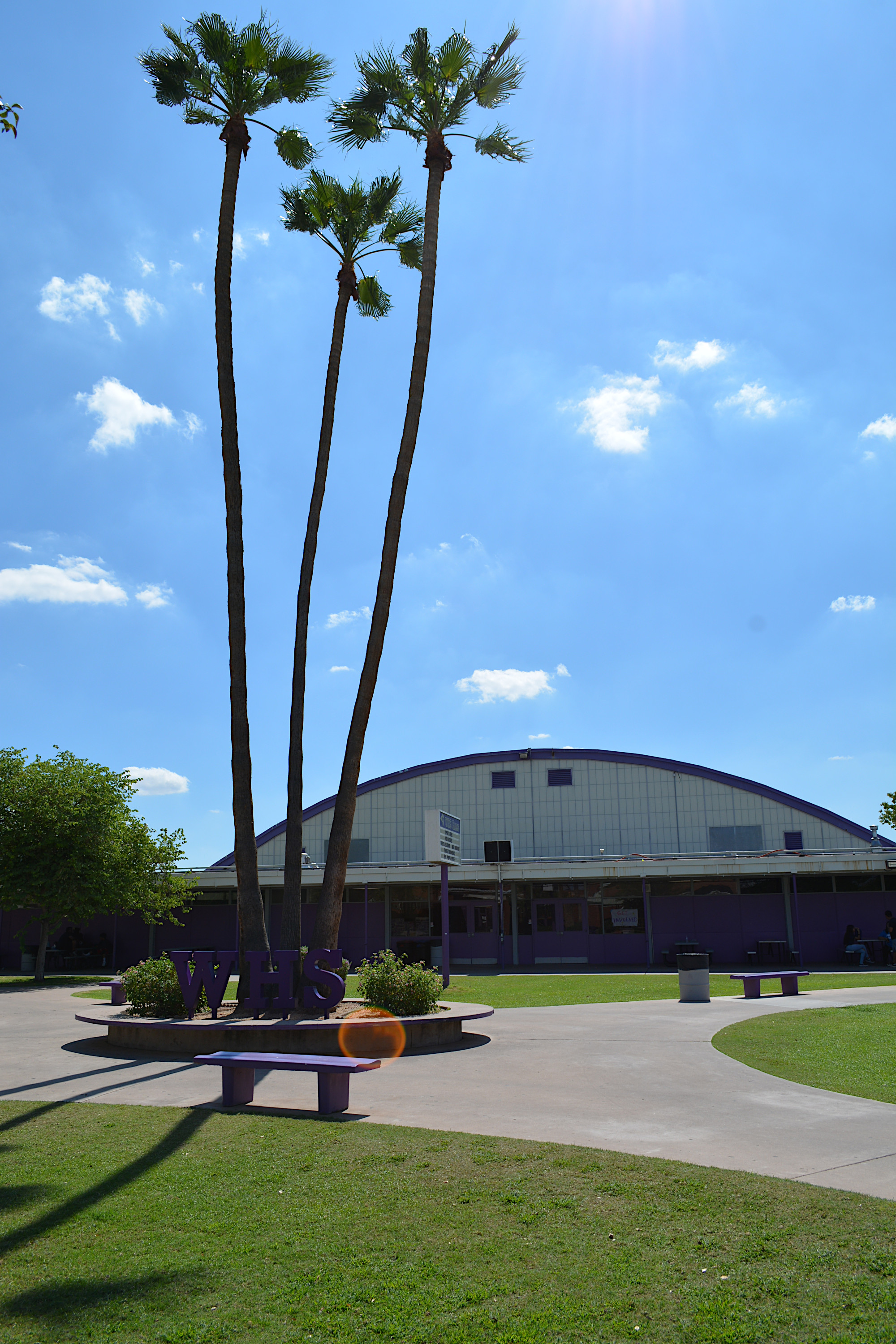 Mark took this very nice shot of the front of our old gym with three picturesque palm trees and big WHS letters at their base. |