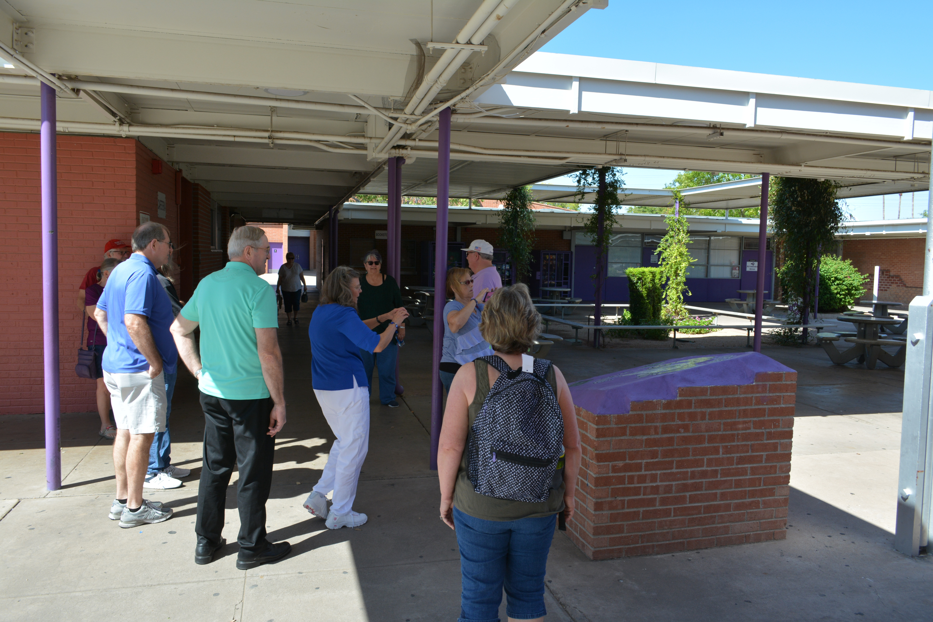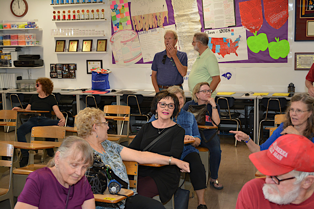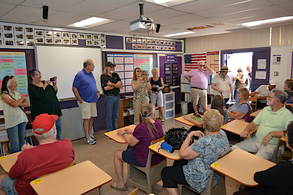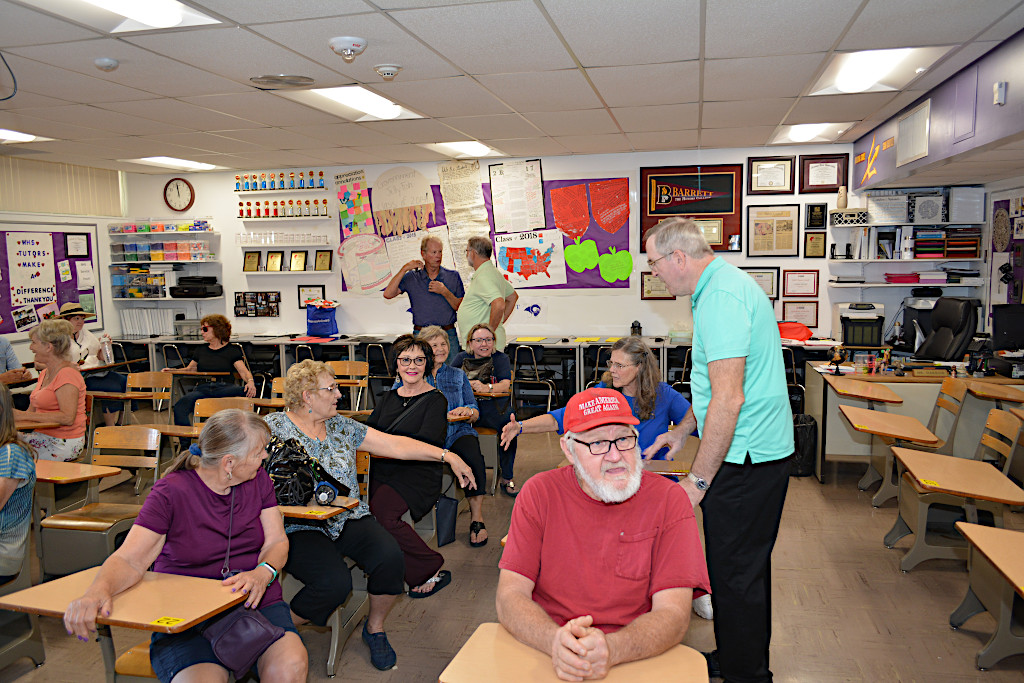 Trudi moved closer to the principal to get more of a straight-on photo. Now everyone's face is visible. Lot of smiles so it appears that everyone had a good time on the tour of their old high school. It's now 12:30pm, which leaves plenty of time to get back to the Sheraton and get ready for the 50 Year Reunion.