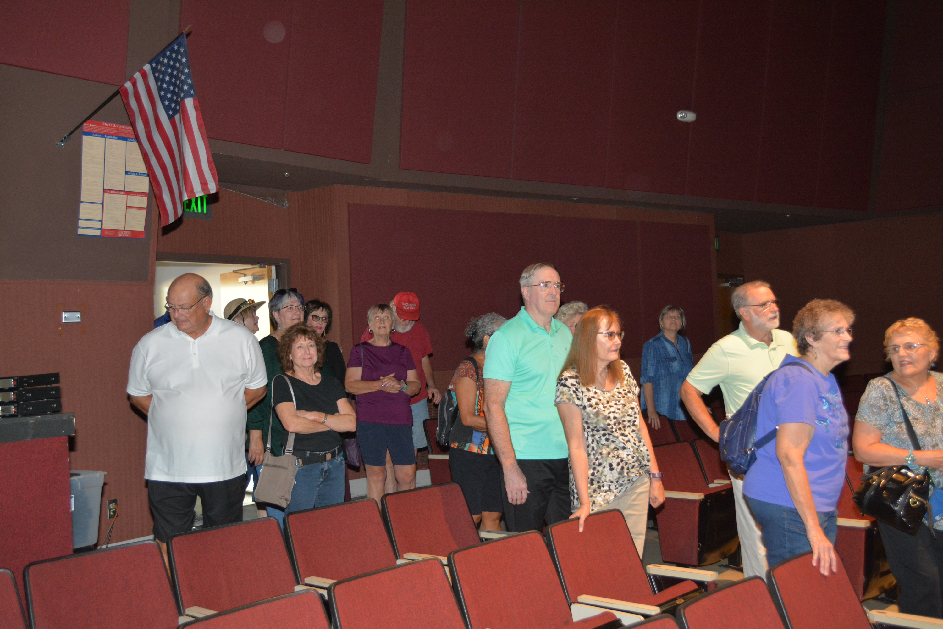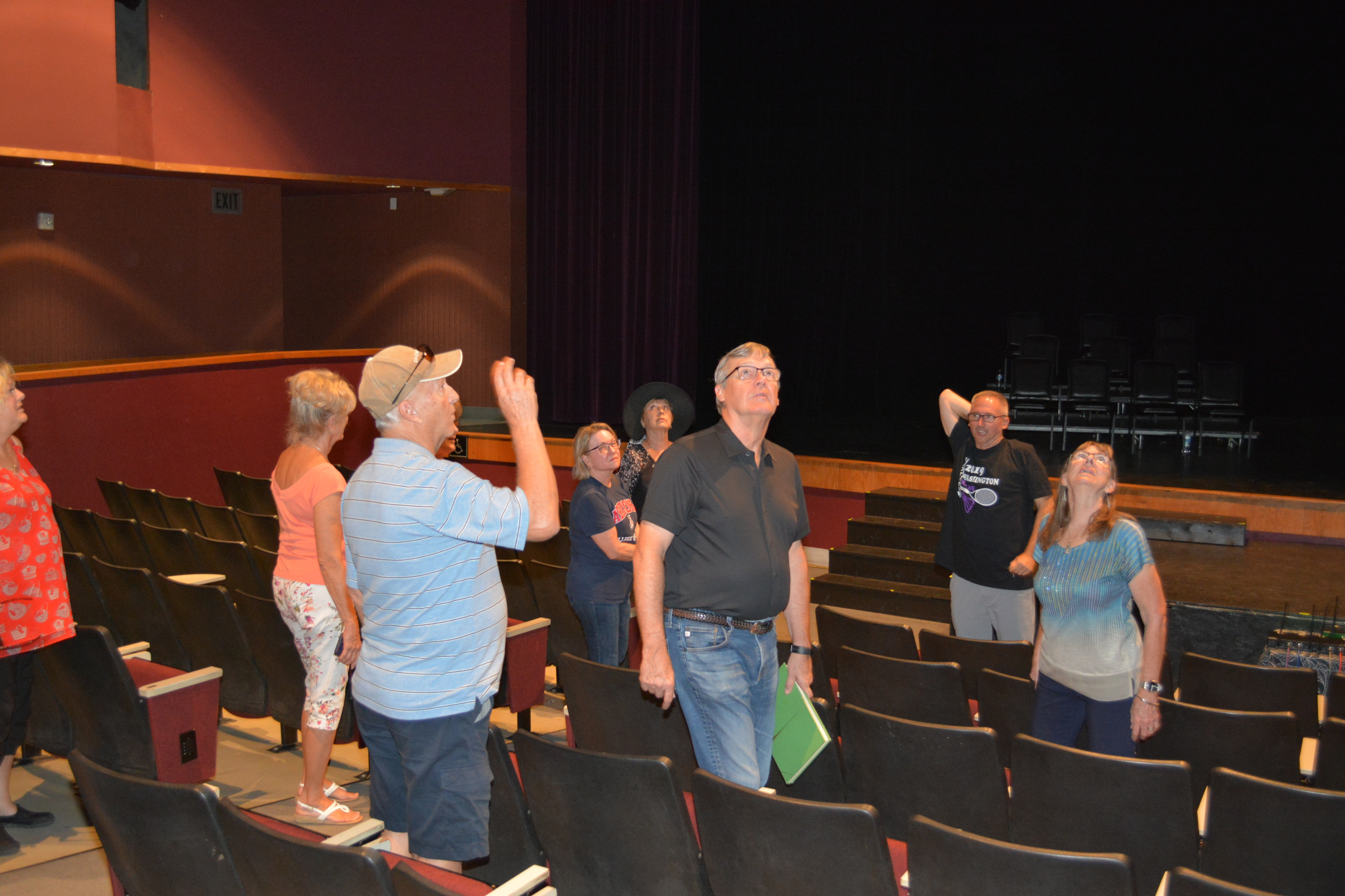 Several classmates are looking up to check out the elevated main control center at the rear of the auditorium.