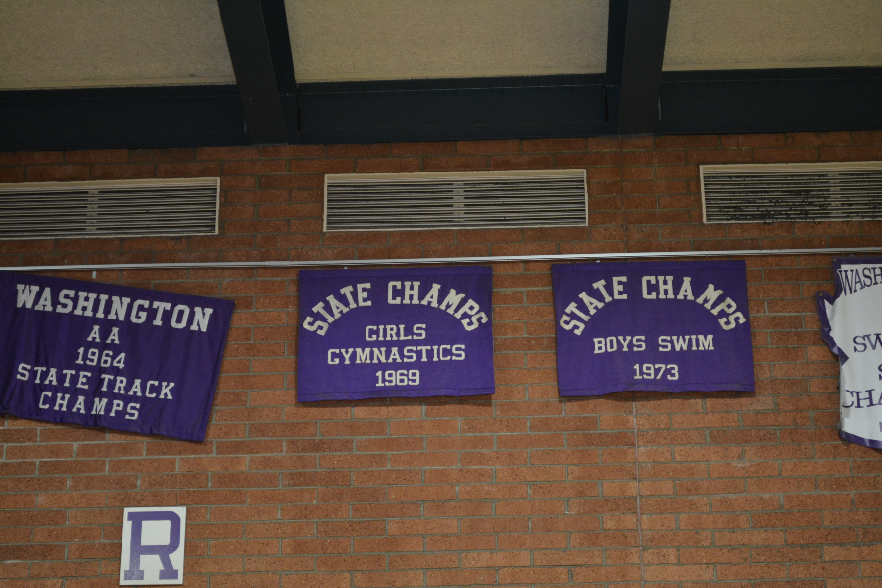banner recognizing the girls gymnastics team of 1969 as State Champions.