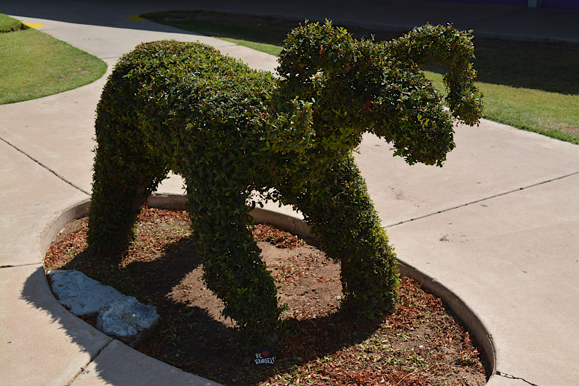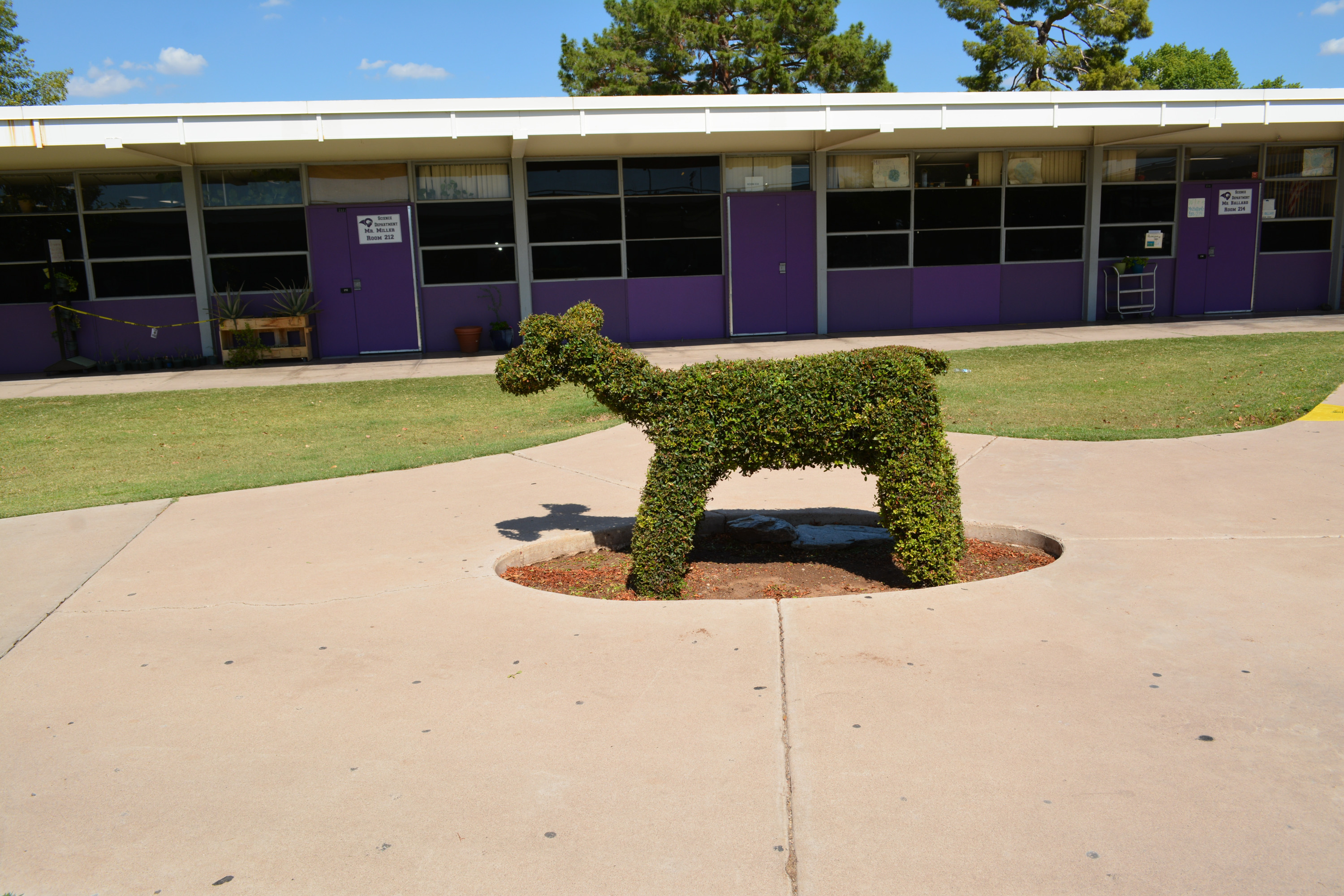 In between the classroom buildings is a bush in the shape of a the