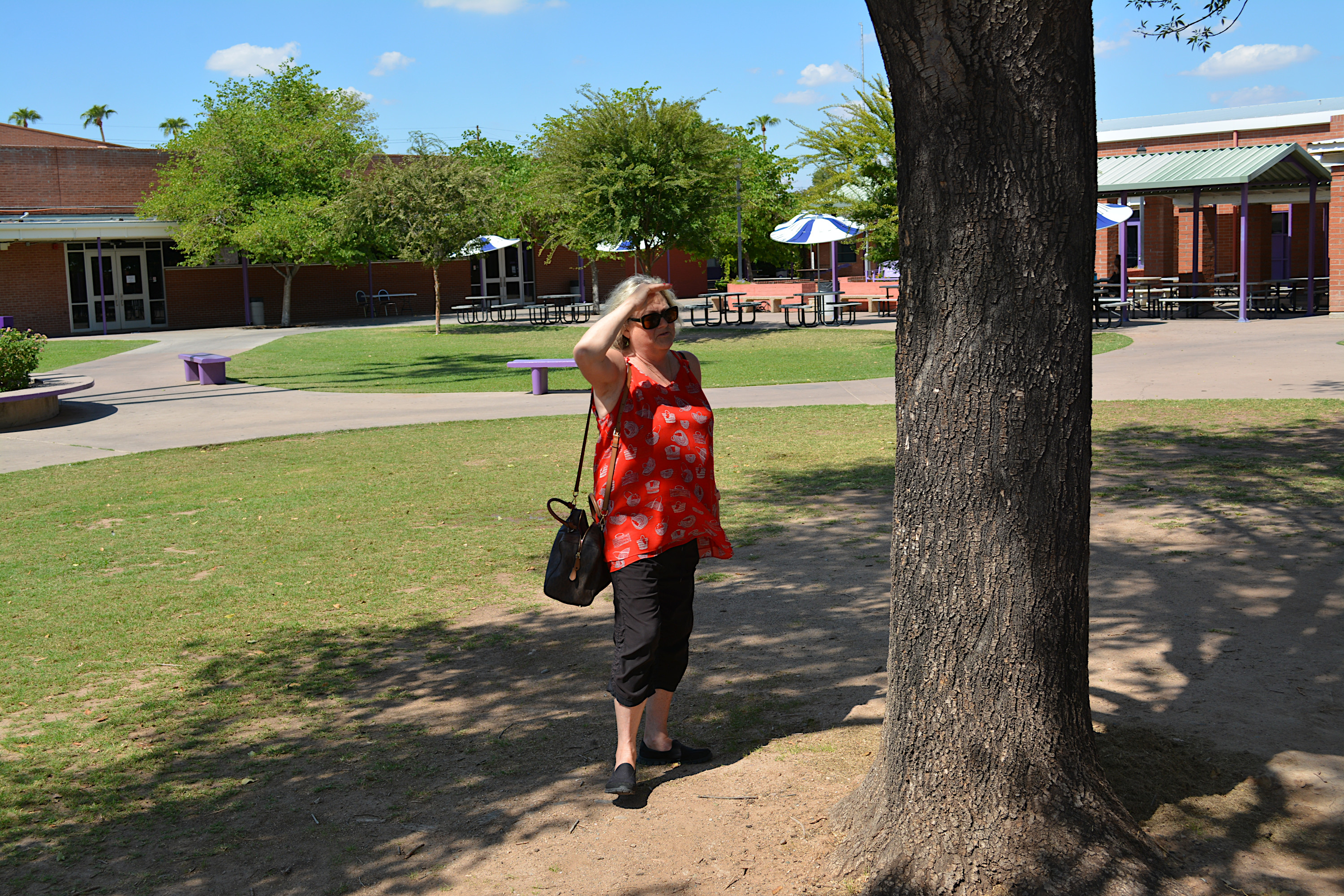 Meanwhile, back outside, we see Marilyn staring at a tree. Not sure why. Was her initials there?